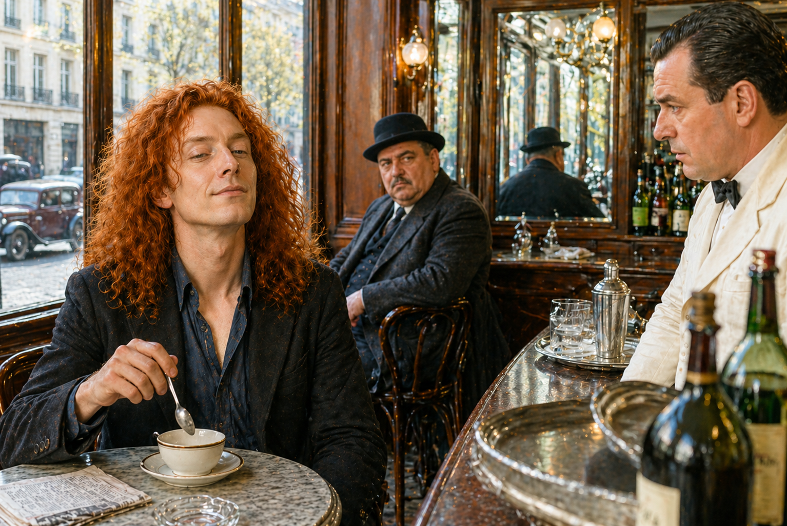 受け皿に|スプーンが|当たる|音が、特に|赤髪の男が|陣取る|隅から|聞こえたとき、バーテンダーも|メグレも|同じくらい|驚いた。