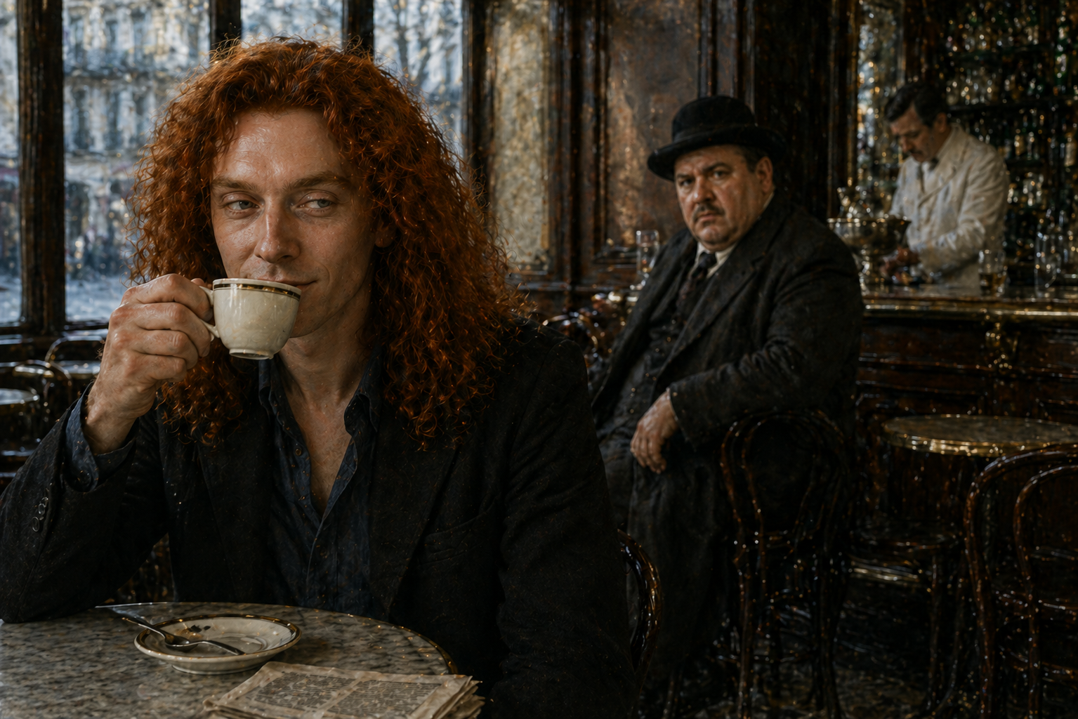 赤髪の男は|カフェ・クレームの|カップを|唇に|運んでいた。||外の方を|振り向かなかった。