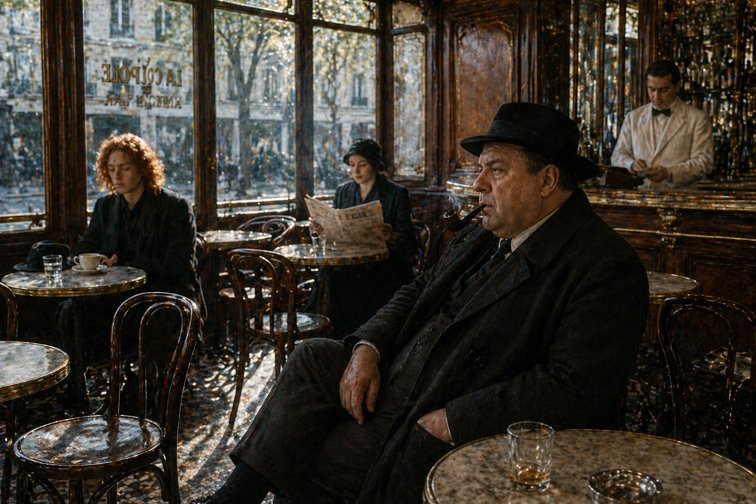 メグレは|顔色を|変えなかった。||支配人は|そのまま|立って、静かに|モンパルナス大通りの|行き来を|眺めていた。
