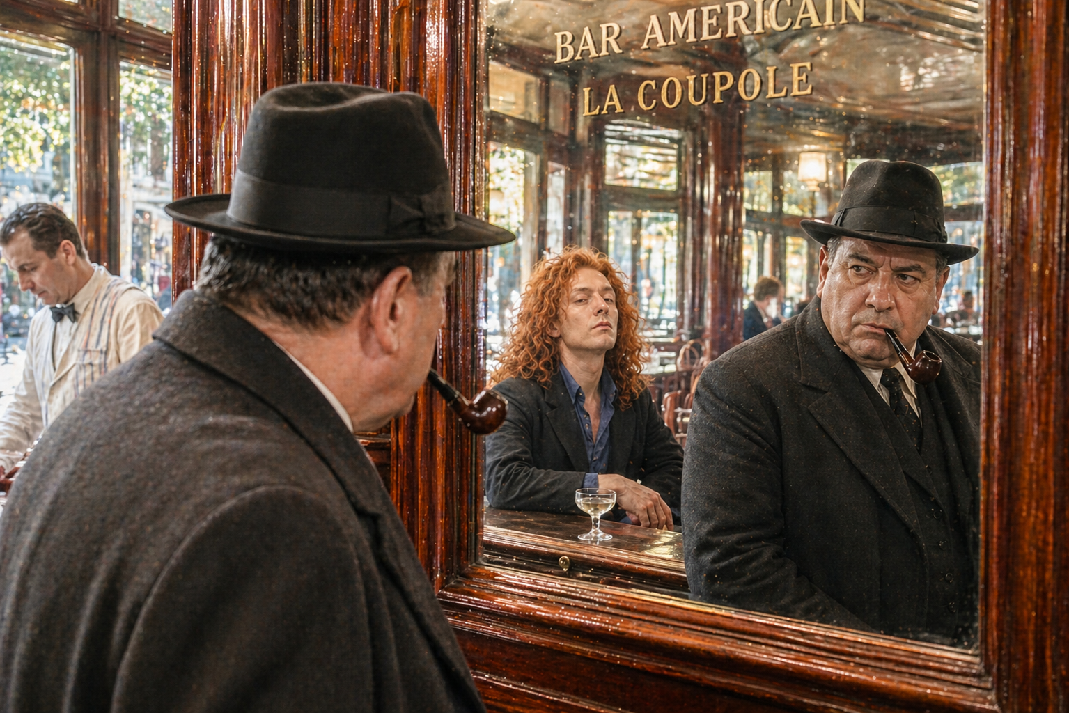 すると|突然、|鏡の中に|メグレは|顔を|見た。||濃い|眉の下の|二つの|鋭い目、|かすかに|浮かんだ|しかし|皮肉に|満ちた|微笑み。