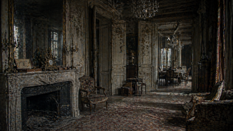 陰気で、|豪華でありながら|惨めだった。||一階は|四年前、|つまり|ムッシュー・ヘンダーソンが|亡くなって|以来|使われていなかった。