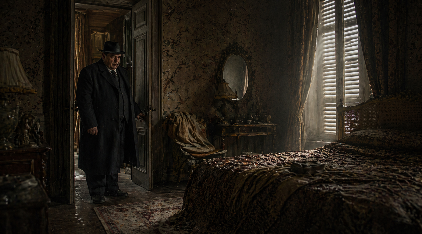 数歩|急いで|進み、|亡くなった|夫人の|小居間に|出た。||寝室の|扉が|半開きに|なっていたが、|入っても|何も|見えなかった。||しかし|匂いは|はっきりした。||床には|煙草の|細かい|灰が|あった。