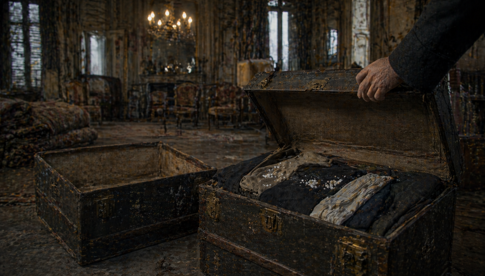 隅には|高価な|絨毯が|巻いて|置かれていた。||肘掛け椅子は|部屋の|奥に|押しやられ、|トランクが|無秩序に|積まれていた。||一つは|空だった。||もう一つには|防虫剤の|球を|散らした|故人の|衣類が|まだ|入っていた。