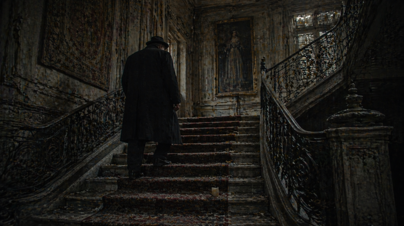 完全な|放置で、|警部は|七月の|捜査で|使った|蝋燭が|階段の|絨毯の上に|まだ|残っているのを|見つけた。
