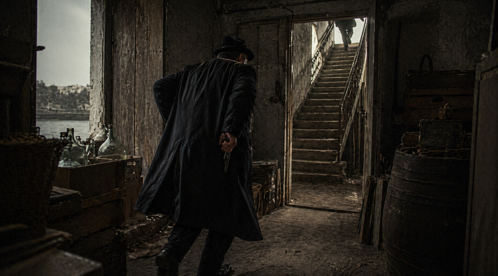 無意識に|拳銃の|ポケットに|手が|いった。||扉に|突進し、|物置部屋を|走り抜けると|勝手口の|階段が|見えた。