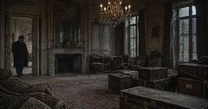 しかし|家具や|調度品の|ほとんどが|そのままに|なっていた。||例えば|メグレが|大きな|サロンに|入ると、|床板が|足音に|軋む|中、|クリスタルの|シャンデリアが|かすかに|チリンと|鳴った。