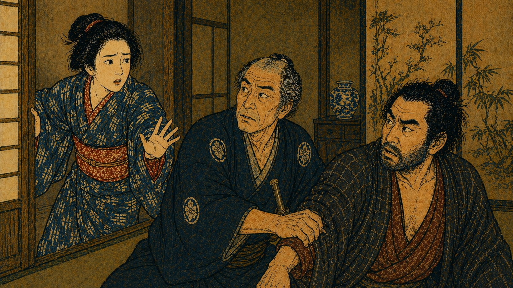 「妾の|お直は|二三日前から、|出るの|引くのという|大喧嘩だ。|――万兵衛は|他に|女が|出来て、|それを|家に|入れようとしているんだ」